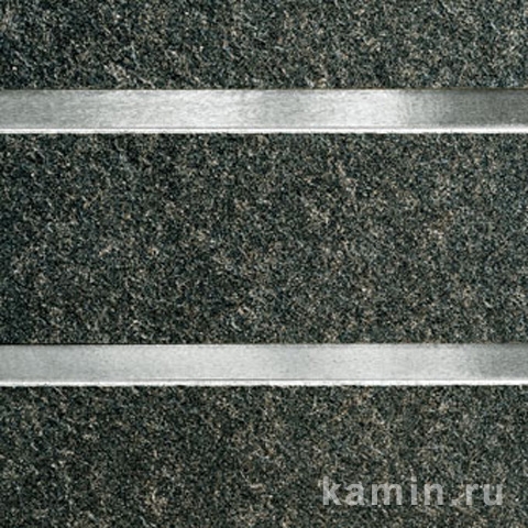 Каминная облицовка из черного гранита с горизонтальными вставками из матовой нержавеющей стали, возможна удлиненная версия.